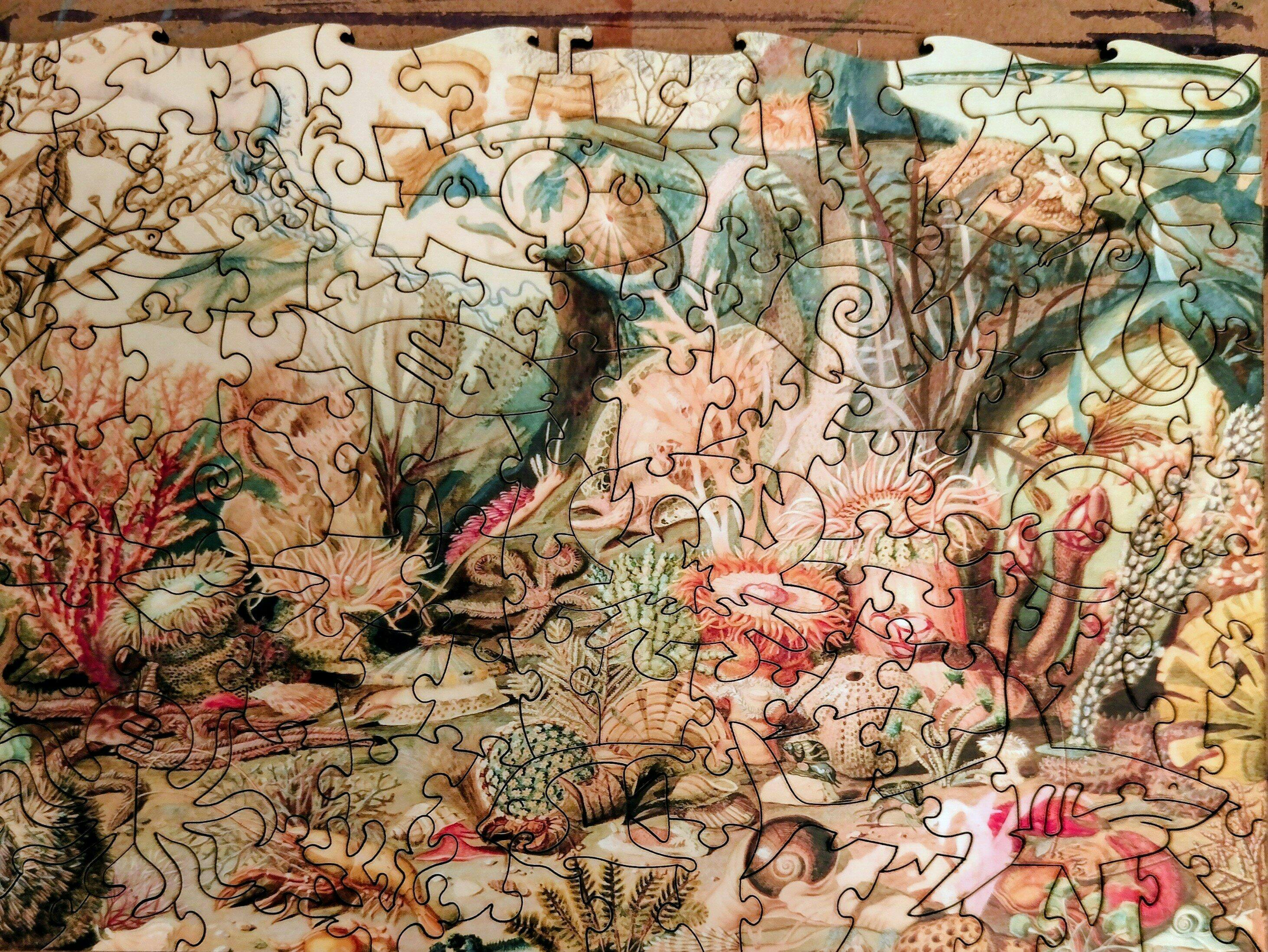 Wow.Lovely difficult unexpected pieces all round. How we like a puzzle to be. Two outstanding features. a submarine at the top with a periscope outside of the rectangle.AND a series of curves slightly off putting until you realise it’s a mega pattern “woven” into the picture to be a whale. Outstanding creativity. Loved it -you are showing Wentworth how to progress. Thank you.