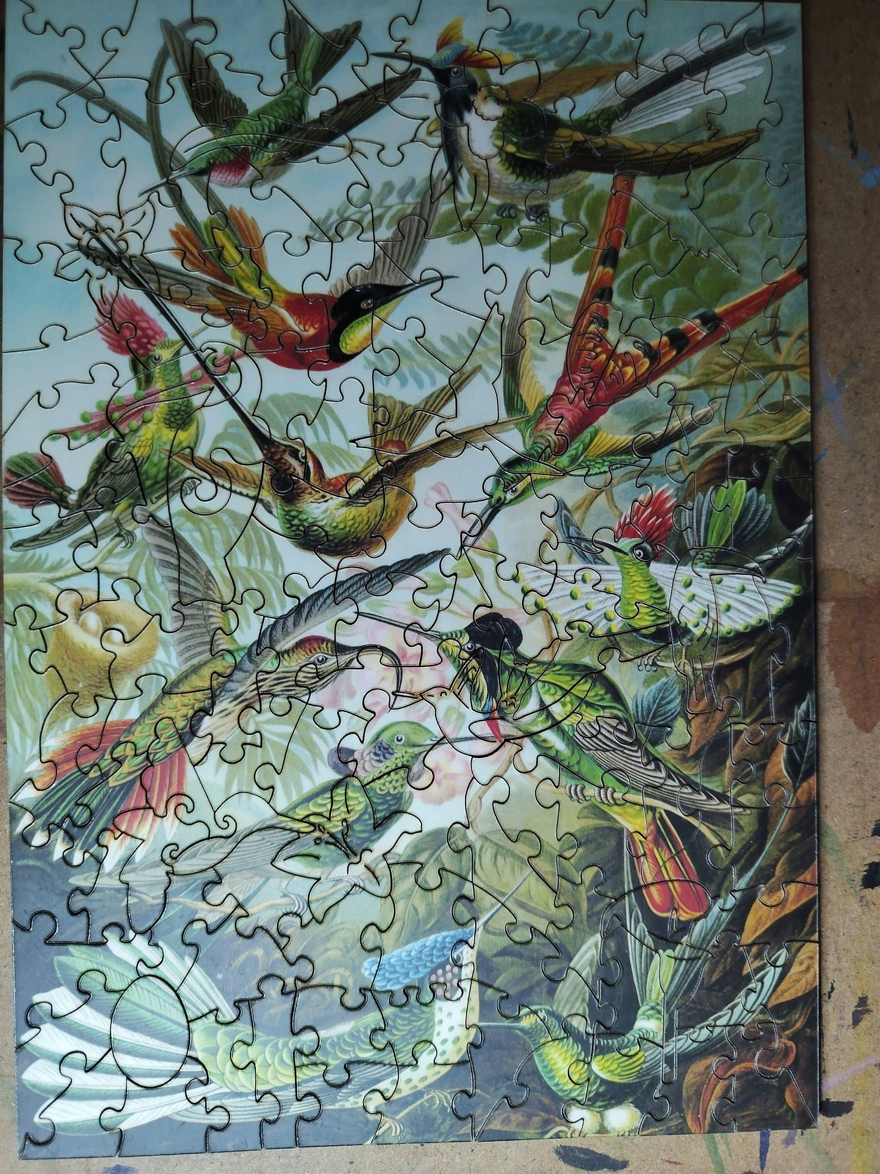 Lovely good quality jigsaw puzzle. Love the bird whimsies. Beautifully packaged with no plastic. I completed this puzzle (130 piece size) on a knee board whilst watching tv. Very enjoyable puzzle.