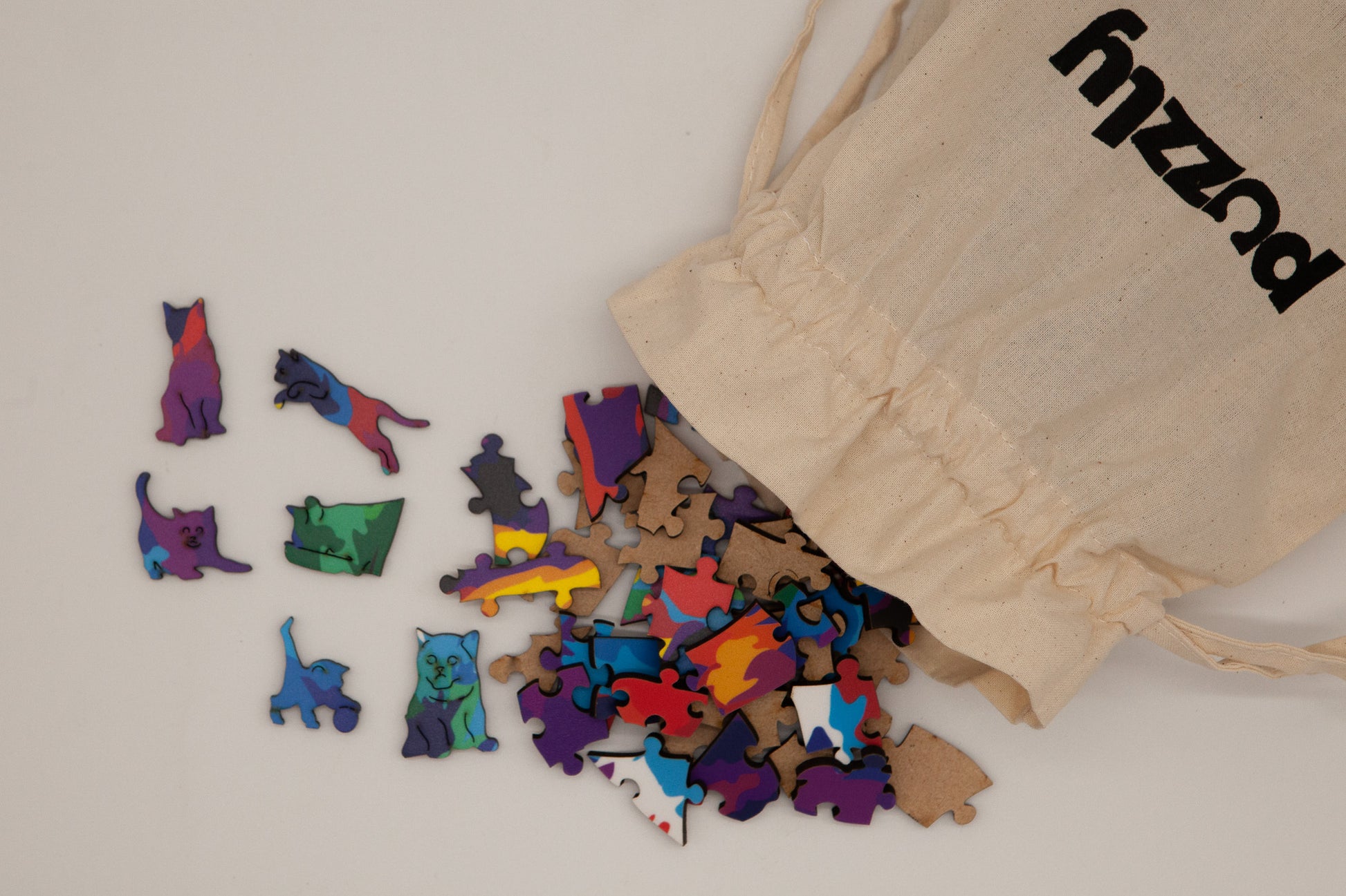 The puzzly has a vibrant colour palate giving a wonderful visual experience. It contains many cat based whimsical characters (and an odd mouse!). A great contemporary art wooden puzzle for the puzzler who likes a challenge.