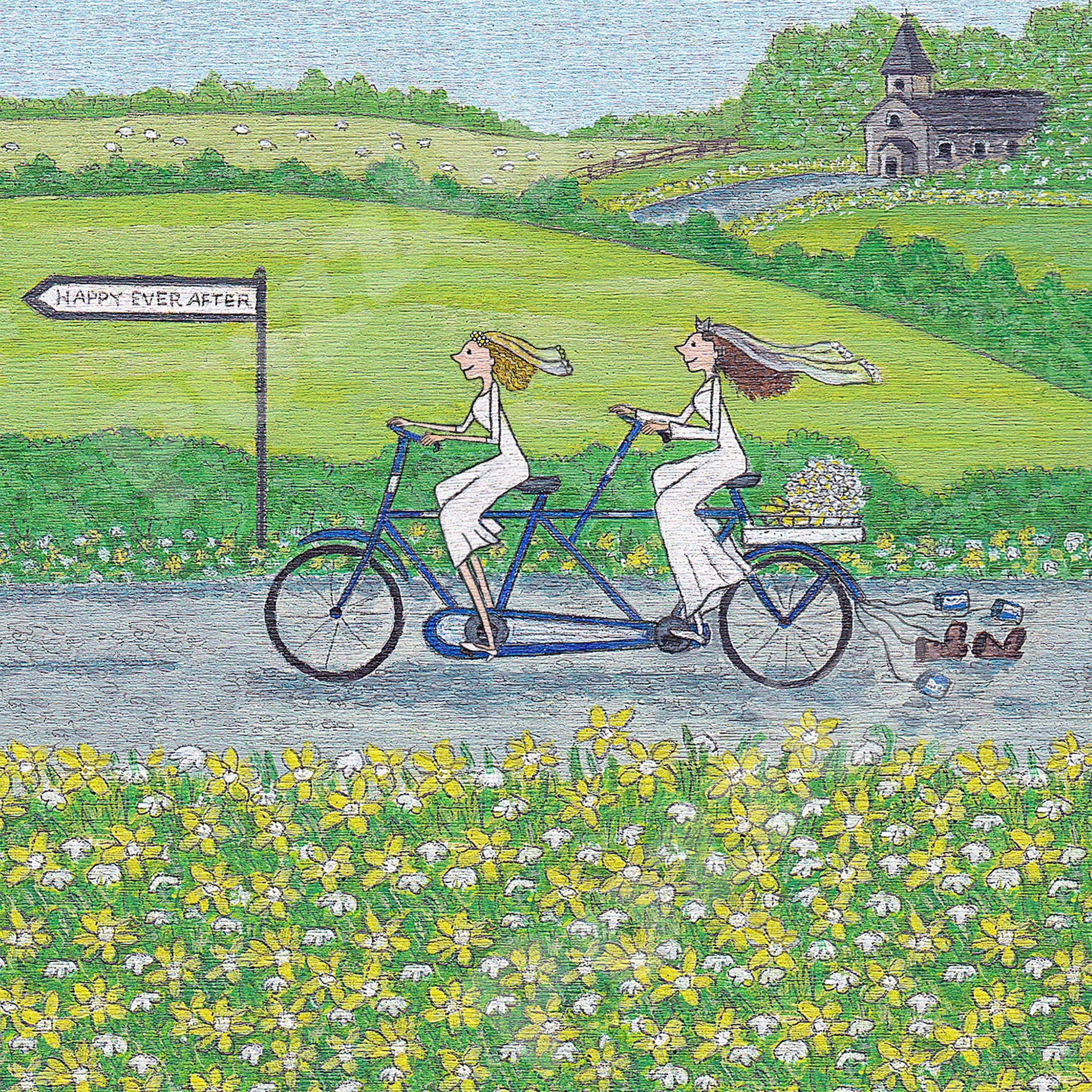 Mrs and Mrs wooden jigsaw puzzle is a humorous puzzle of the Bride and Bride on the road to forever after. The artwork is by the talented Lisa Davies.