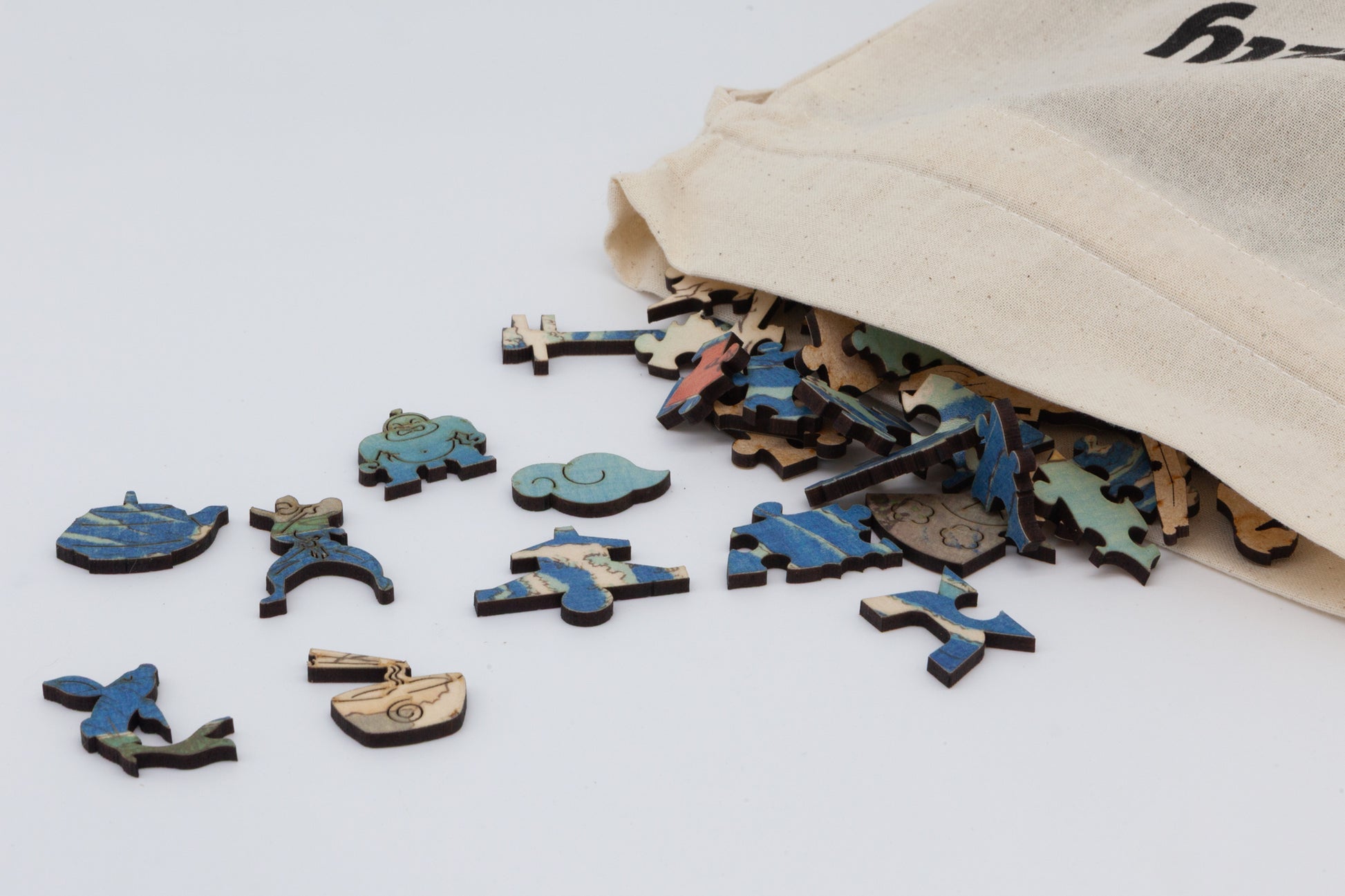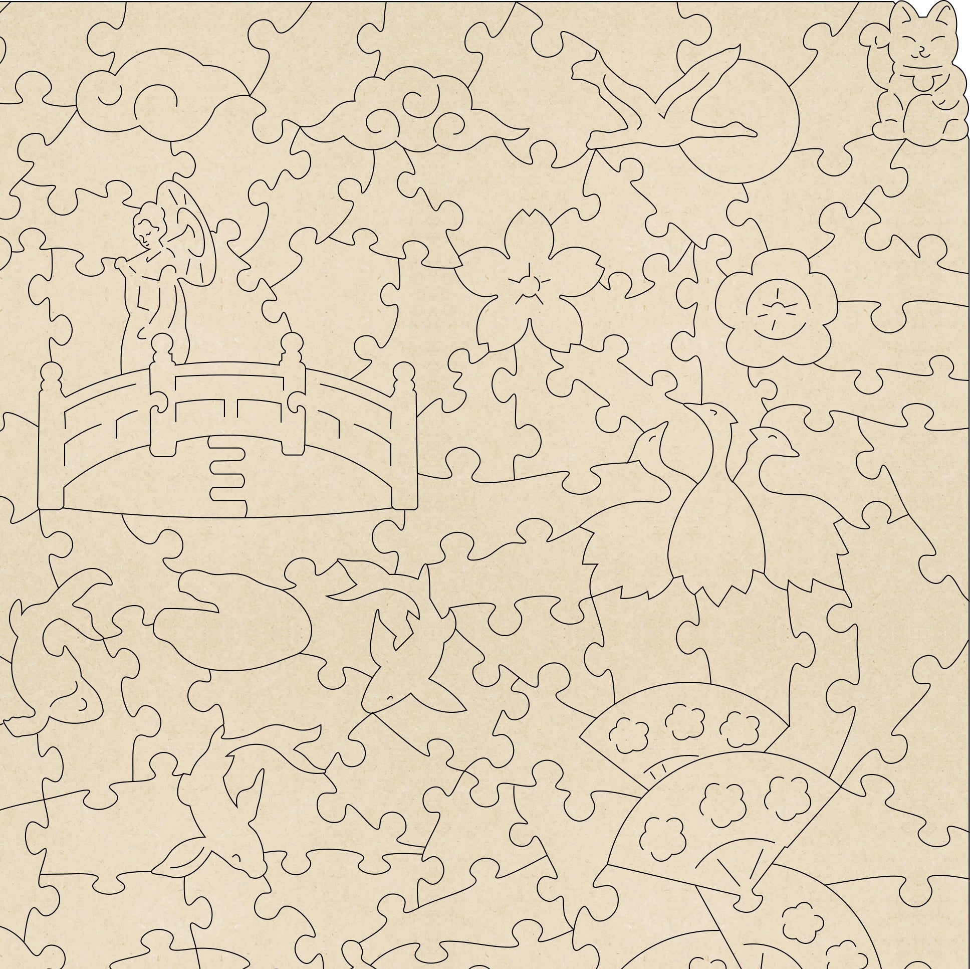 The wooden puzzle pieces are irregular and also contain wonderful Japanese related whimsical shapes, like Japanese Ladies, Samurai Warriors, Japanese landscape scenes and many more fun intricate whimsies.